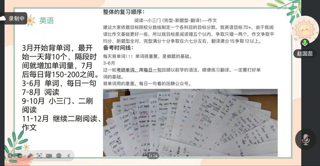 交流会上,5位学长学姐结合自身考研经历,围绕择校定位、初试备考、复试技巧、调剂策略等核心环节,进行了细致深入的分享,内容兼具实用性与针对性,干货满满。学科语文专业的赵国蕊学姐,全面分享了她从专业与院校确定、各科备考(政治、英语、333、专业课)到复试准备的全流程经验,为学子们搭建了清晰的备考框架;现当代文学专业的韩冰学姐,聚焦院校选择的核心逻辑,结合自身情况讲解如何科学择校,并详细拆解了英语、政治、文学基础等科目的备考规划,强调了分阶段复习的重要性;同属现当代文学专业的高国瑶学姐,重点分享了自身调剂经历,着重强调复试备考需回归专业基础、拓宽学术视野,并毫无保留地介绍了调剂信息的搜集与筛选方法,为有调剂需求的学子提供了宝贵参考。新闻传播专业的王美涵学姐,同样以复试与调剂为核心,详细讲解了复试全流程细节、面试应答技巧,并总结出调剂“找学校、筛学校、报学校”三步走的实操建议,极具指导性;国际中文教育专业的郦一诺学姐,介绍了上海大学相关专业的招生情况,分享了“效率为王”的备考原则,同时针对公共课及汉语基础、文化要略、教学论等专业课,提供了高效实用的复习方法,为瞄准同类院校和专业的学子指明了方向。