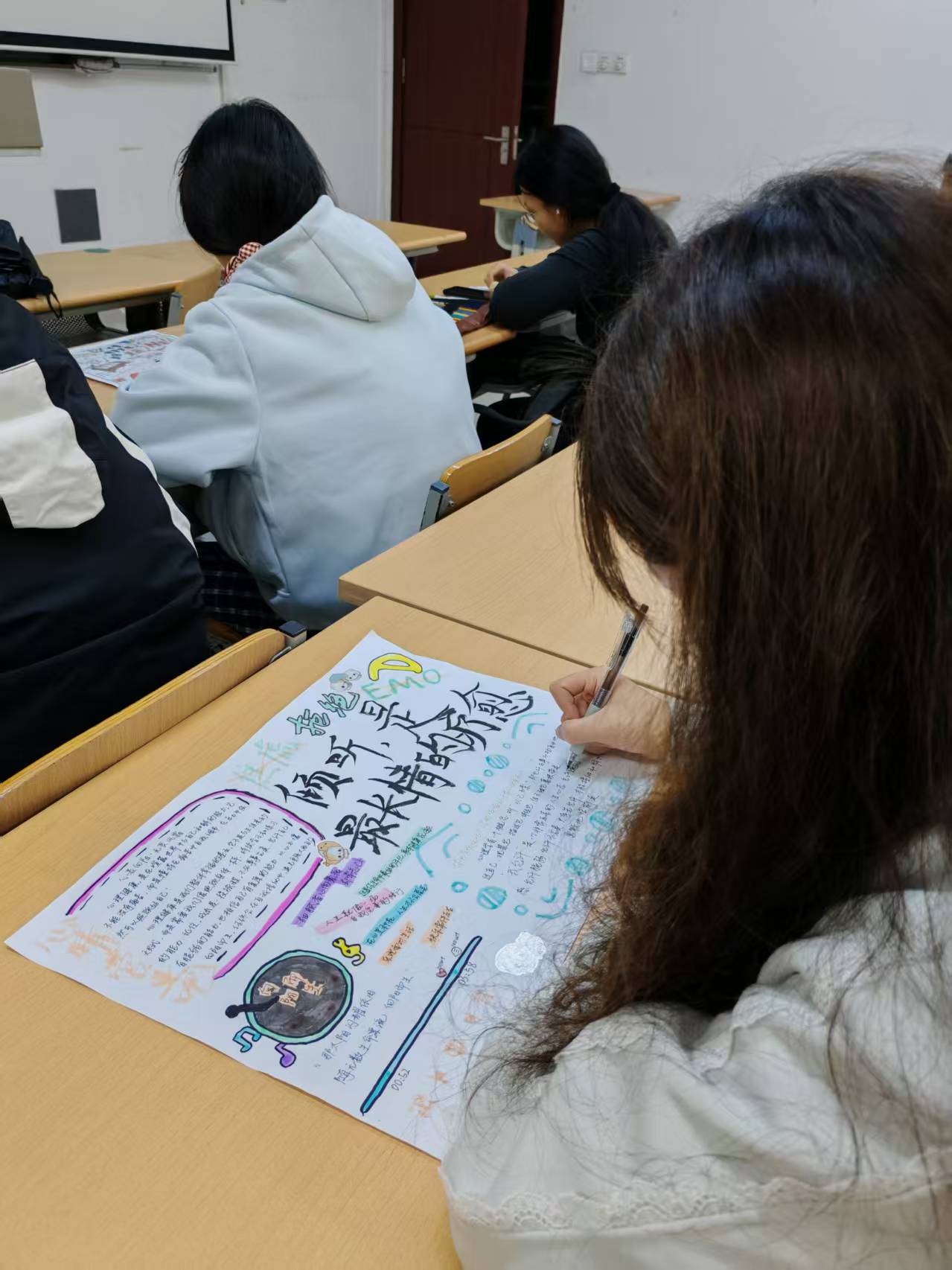 活动在轻松融洽的氛围中展开。同学们依据个人情绪感受与生活体验,自由选取绘画工具,借助色彩、线条与图案,描绘内心的情感世界。一幅幅作品构思精巧,色彩鲜明:温暖的色调中流淌着关怀与共情,细腻的笔触下蕴含了对自我与他人的深深理解,充分展现了同学们对精神健康的重视与对心灵成长的期盼。创作结束后,同学们主动分享创作理念,在交流中深化对心理健康的认识,也拉近了彼此的距离。