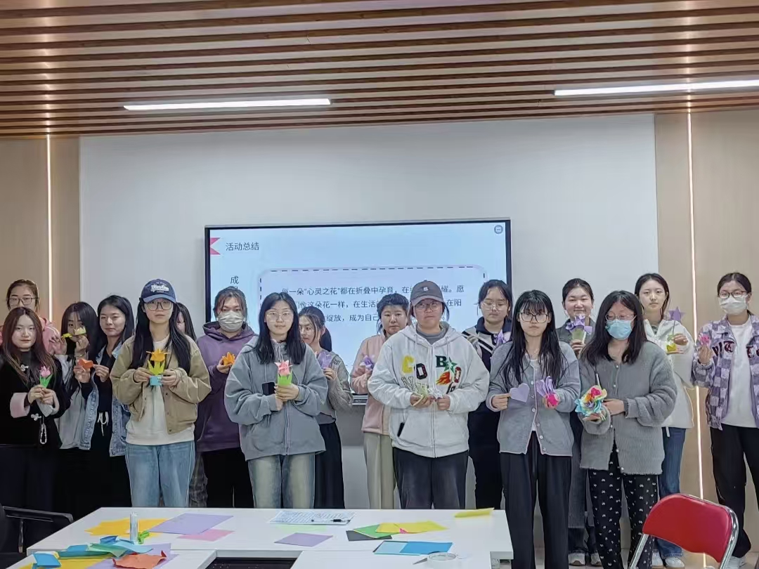 活动伊始,学生们挑选了自己心仪的彩色纸张,开启了充满创意与乐趣的折纸之旅。在折叠、翻转纸张的过程中,大家全神贯注,沉浸在指尖艺术的魅力中。遇到难题时,学生们相互交流、彼此协助,共同克服困难。随着一张张平凡的彩纸逐渐变成造型多样、精致美丽的“心灵之花”,现场气氛也愈发温馨融洽。此次活动不仅锻炼了学生们的动手能力,激发了他们的创造力,还通过团队协作增强了彼此间的信任与凝聚力。折纸作为一种从无到有的艺术形式,象征着成长与蜕变。学生们在完成作品的过程中,不仅收获了内心的平静与满足,也深刻体会到了专注与坚持的意义。活动结束后,学生们纷纷展示自己的作品,并分享创作心得。现场洋溢着欢声笑语,大家通过艺术创作表达情感、传递温暖。