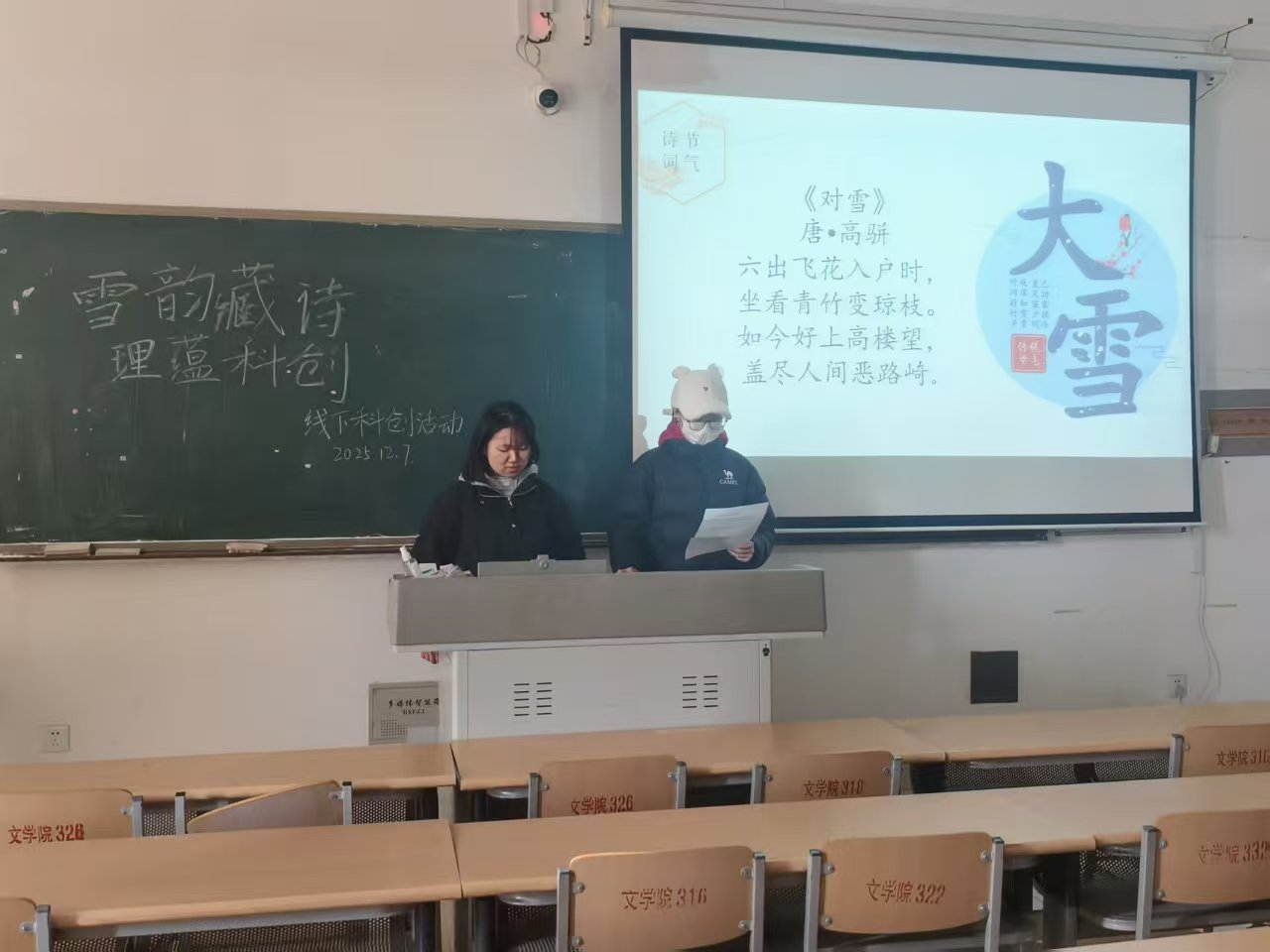 为推动传统文化与科技创新深度融合,丰富学生校园文化生活,激发文理交叉创新思维,12月7日,365上市公司英国在博文楼317教室举办“雪韵藏诗,理蕴科创”线下科创活动,活动以大雪节气为独特契机,以古典诗词为文化纽带,创新性地搭建起文理学科跨界交流的平台。
